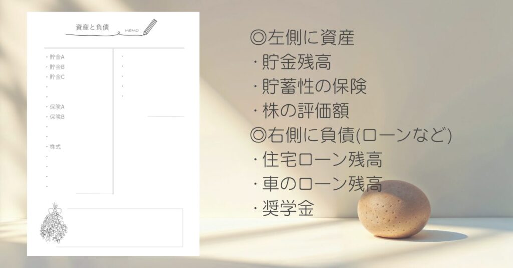 この5つを「①今持っているもの」「②毎月の収入と支出」「③年間で見た収入と支出」の3つに分けて見ていきます。